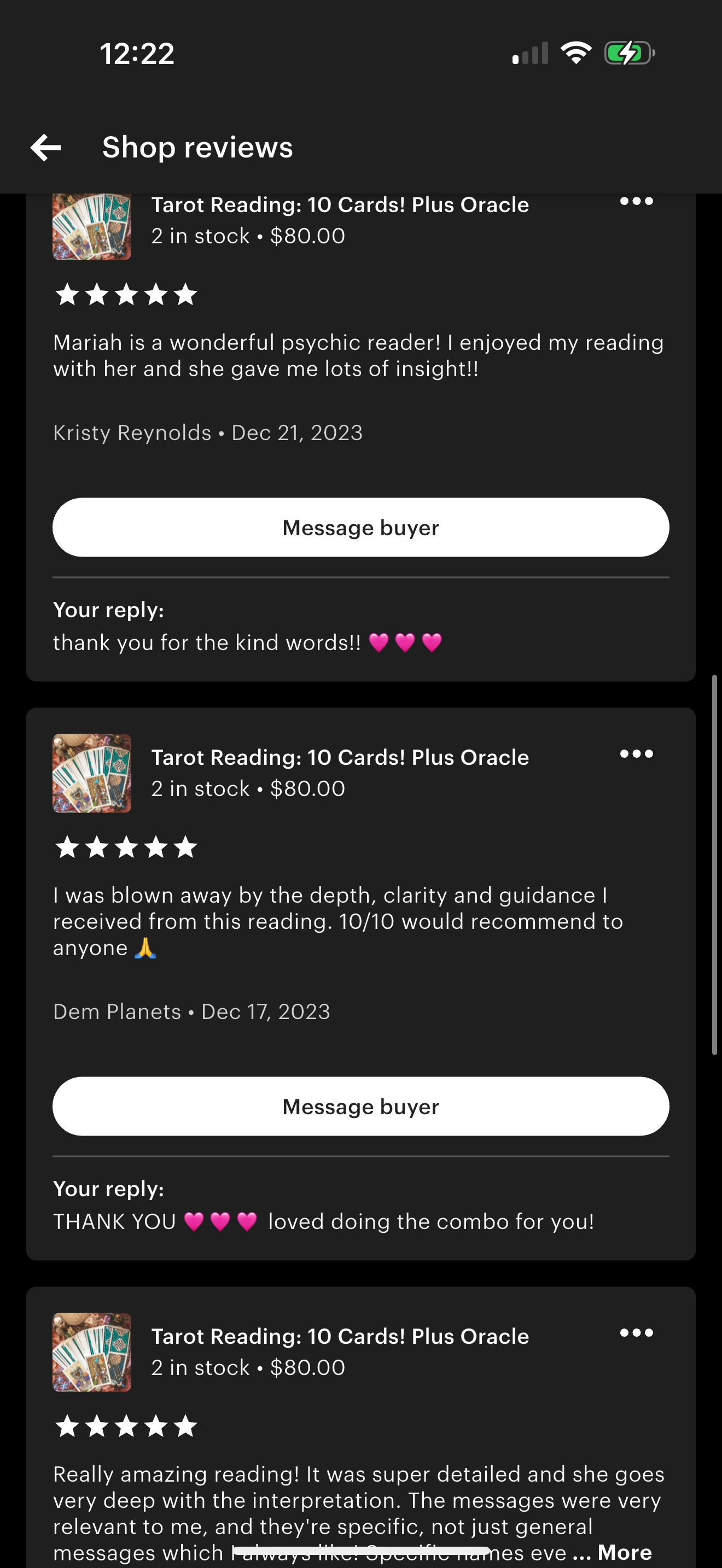 Mariah was flexible in that I accidentally booked the day after the one I wanted & she kindly met with me on the day I preferred. Mariah explained the cards well and provided possible versions of what they might mean for me. [After our session, I felt] Energized & inspired. There were some very interesting points made in my reading that rang true for me. Other points only time will tell.” – Sue, Tarot